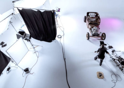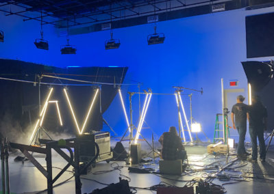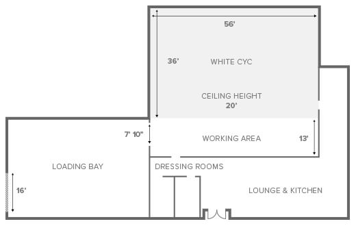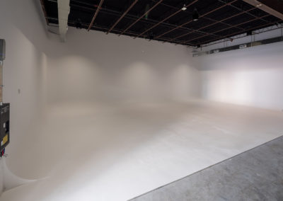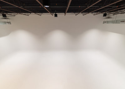 - 36’9″ x 56’6″ x 20’ white cyc with option to turn into green screen